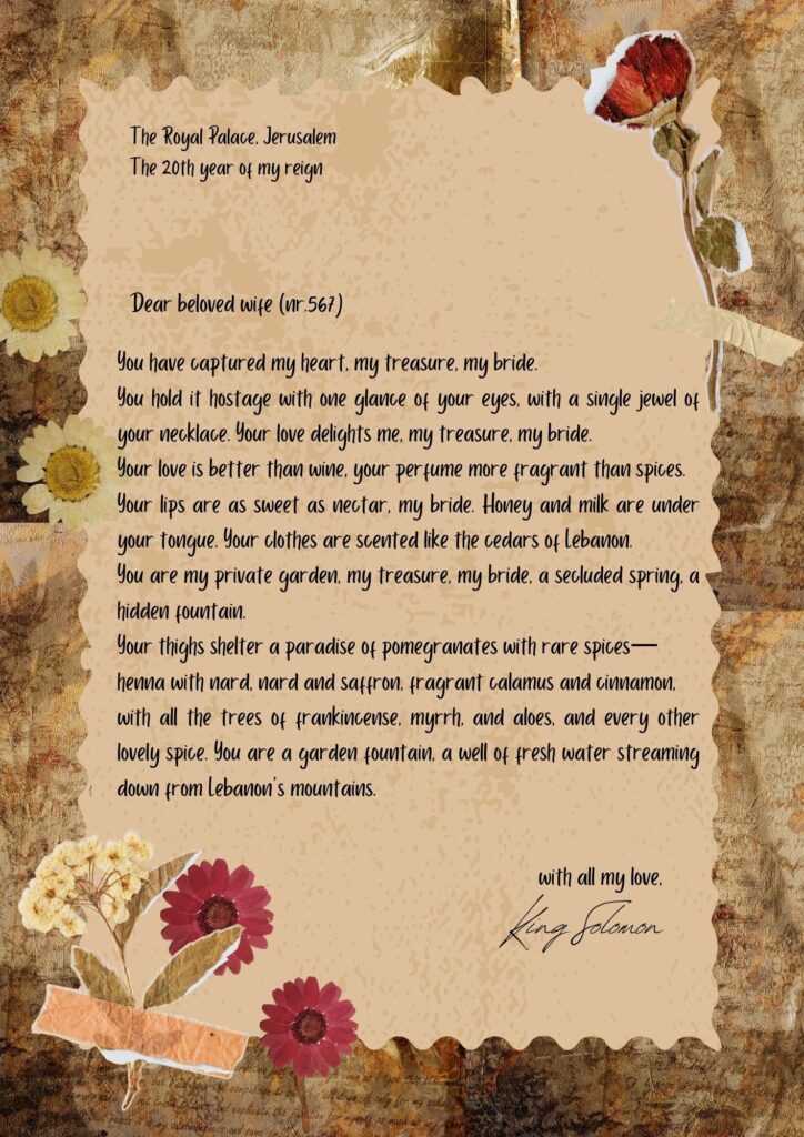 - Romantic words matter – Solomon was the king of smooth-talking. He showed that love isn’t just about acts of service—he made sure his women knew he loved them not just with his actions but also with his words! It’s important to speak life into your relationship. He took time to praise and cherish his beloved, showing that love is more than just physical attraction—it’s about deep admiration and emotional connection.